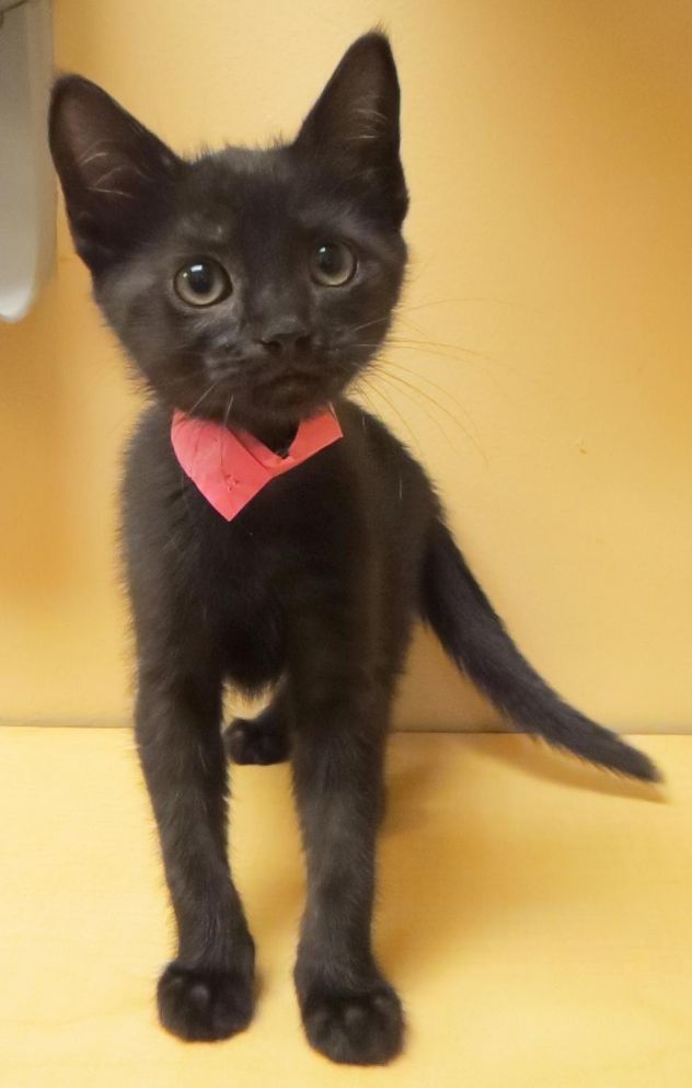 This adorable little kitty is Jolie, an 8 week old black domestic short-hair female. Jolie is happy, energetic, and VERY playful. She should fit in perfectly with any active household. Jolie would love to be adopted with her sibling Cat Pitt but can also be adopted on her own if you don't want to take on two cats at once. Jolie is currently at the Last Chance Animal Rescue in Waldorf, Maryland.